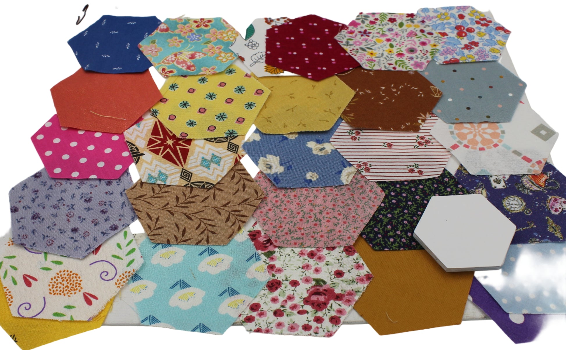 - 28 1 1/2" pre-cut fabric hexagons in a beautiful variety of colourful patterns