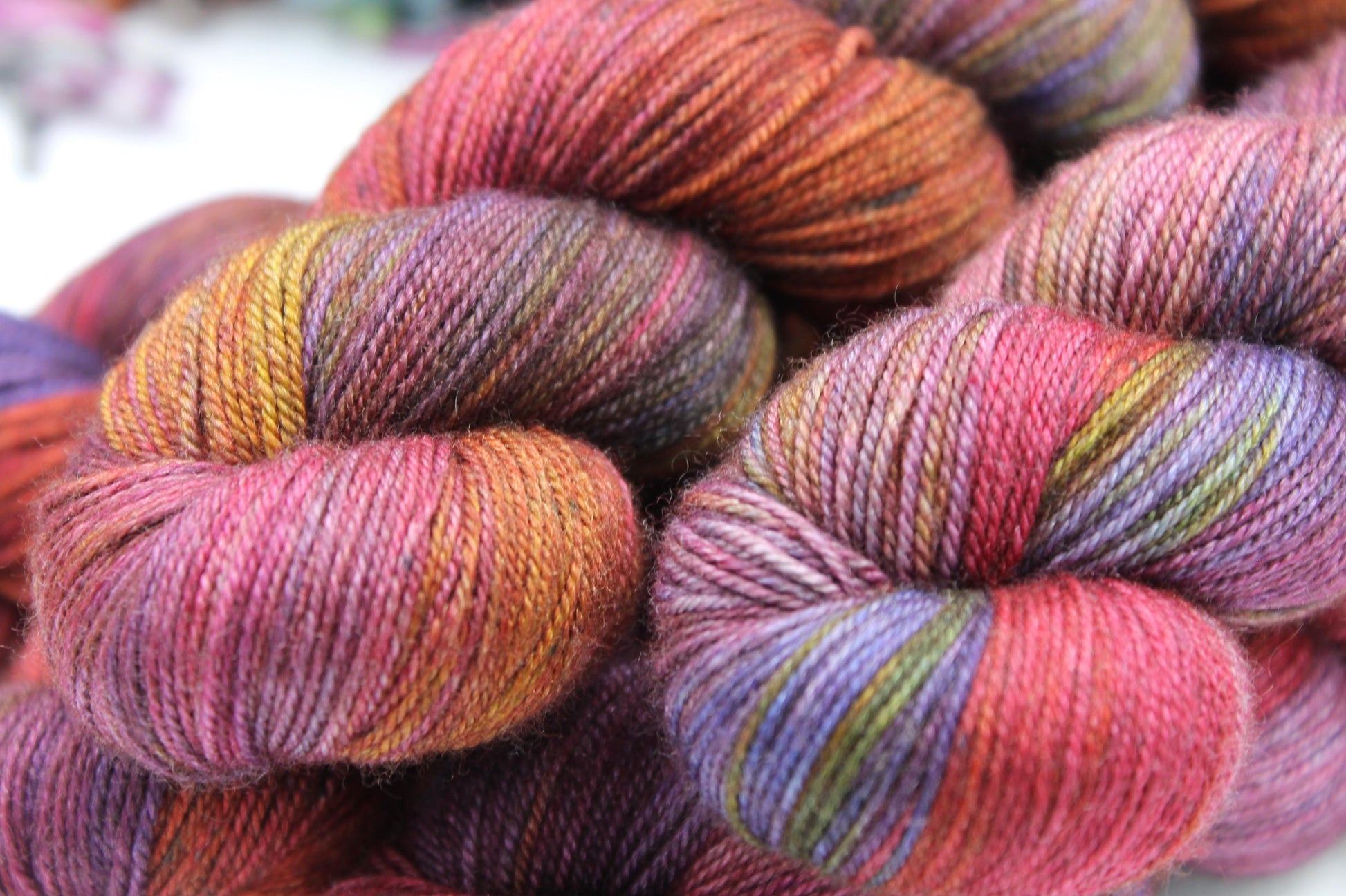 Each skein is hand-dyed using professional acid dyes. Although each skein is dyed in a batch, unique they will remain and no other skein will ever be quite like it.