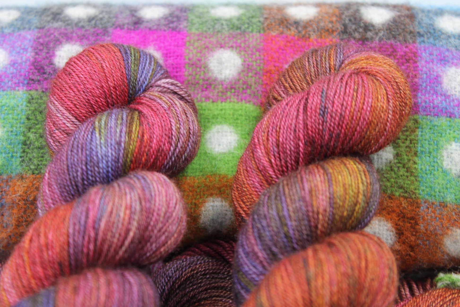 Each skein sports a range of complimentary colours swirled throughout the yarn.