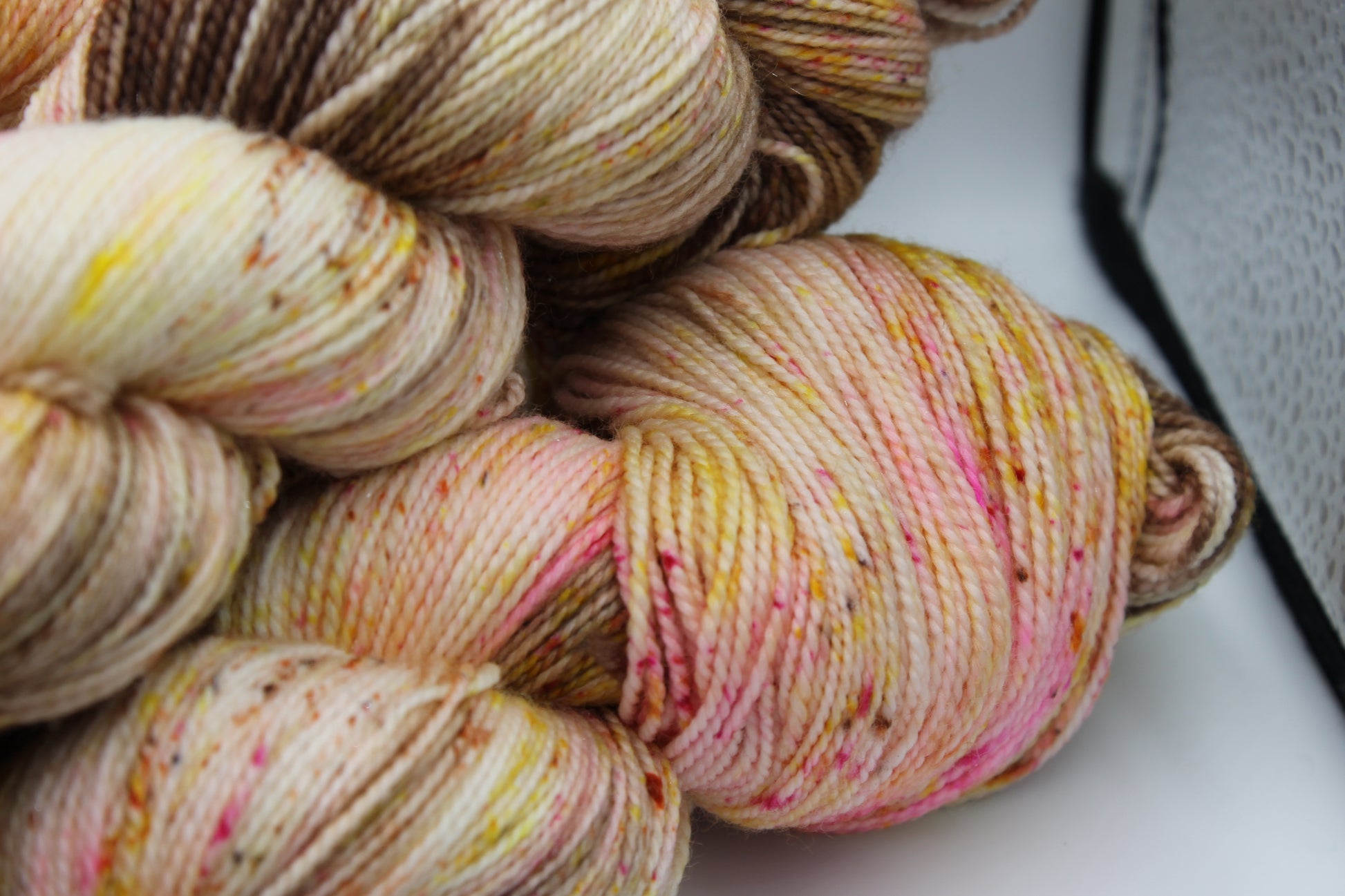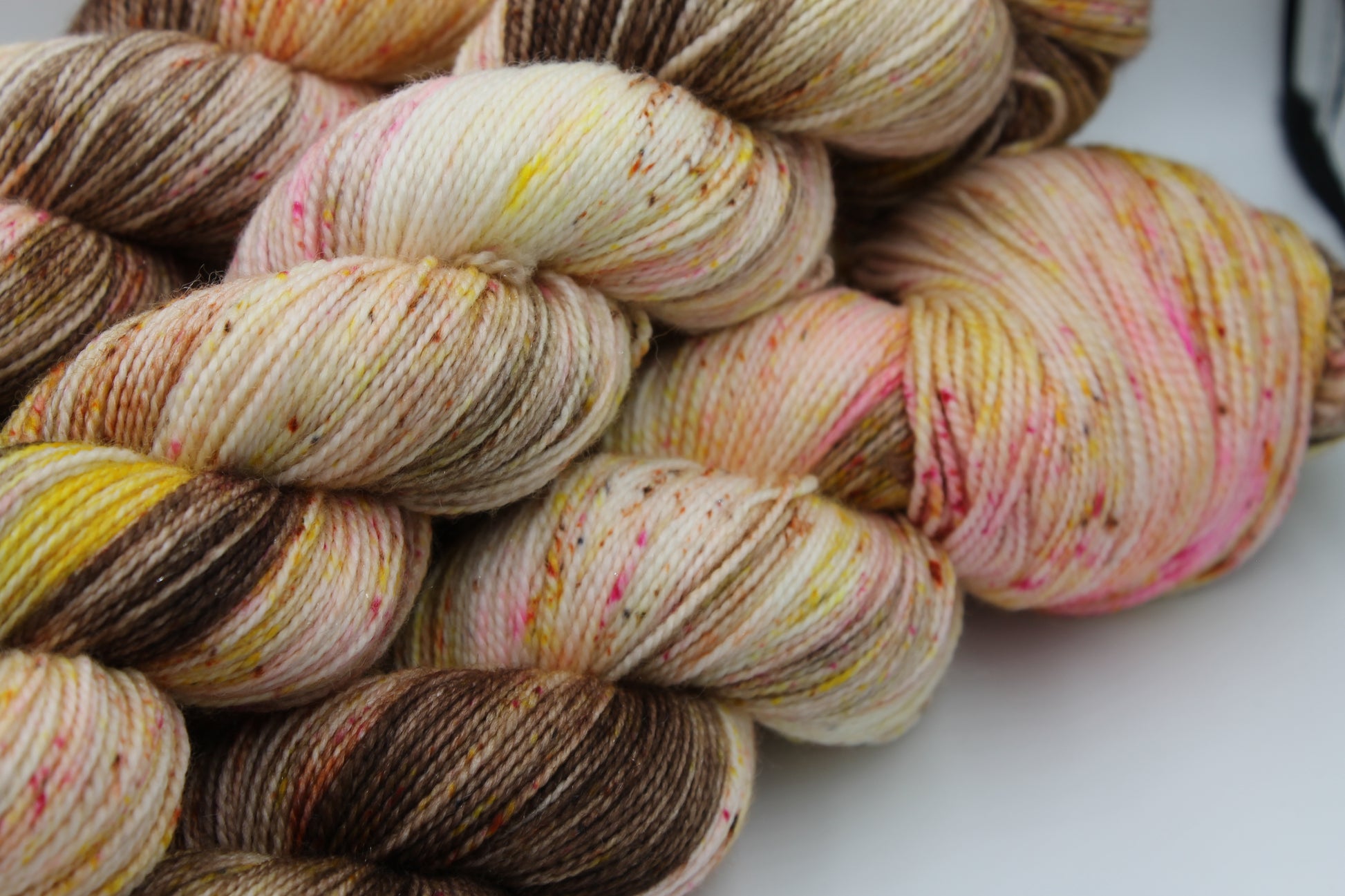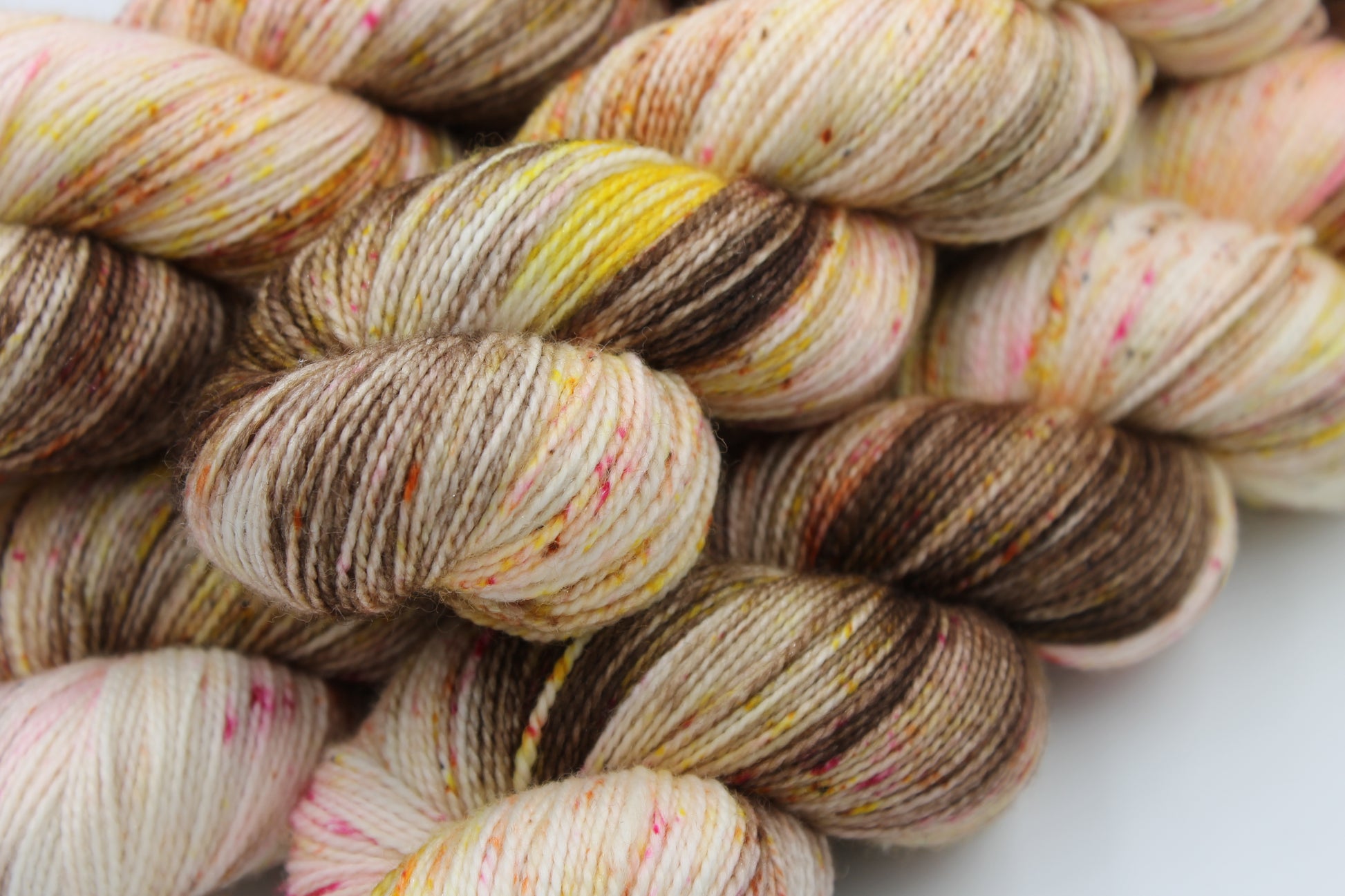 Hot Chocolate And All The Trimmings Sock 75% Superwash Merino 20% Nylon 5% Silver Stellina. 1 x 100g Skein Each skein sports a range of complimentary colours swirled throughout the yarn. Hand dyed sock yarn Approximately 425m per 100g skein 75% SW Merino 20% Nylon 5% Silver Stellina Each skein is hand-dyed using professional acid dyes. Although each skein is dyed in a batch unique they will remain and no other skein will ever be quite like it. Every effort has been made to wash any excess dye from the yarn, but some may remain; especially with heavy colours. It is recommended to hand wash separately. Shape the products made from this yarn whilst damp and dry flat. Colour represented on a screen can vary from the colour of the yarn supplied although we have made effort to ensure accuracy. Shipping information please read: Standard shipping is second class and does not include tracking or insurance. We use waterproof biodegradable packaging. If you have any questions please feel free to email me.