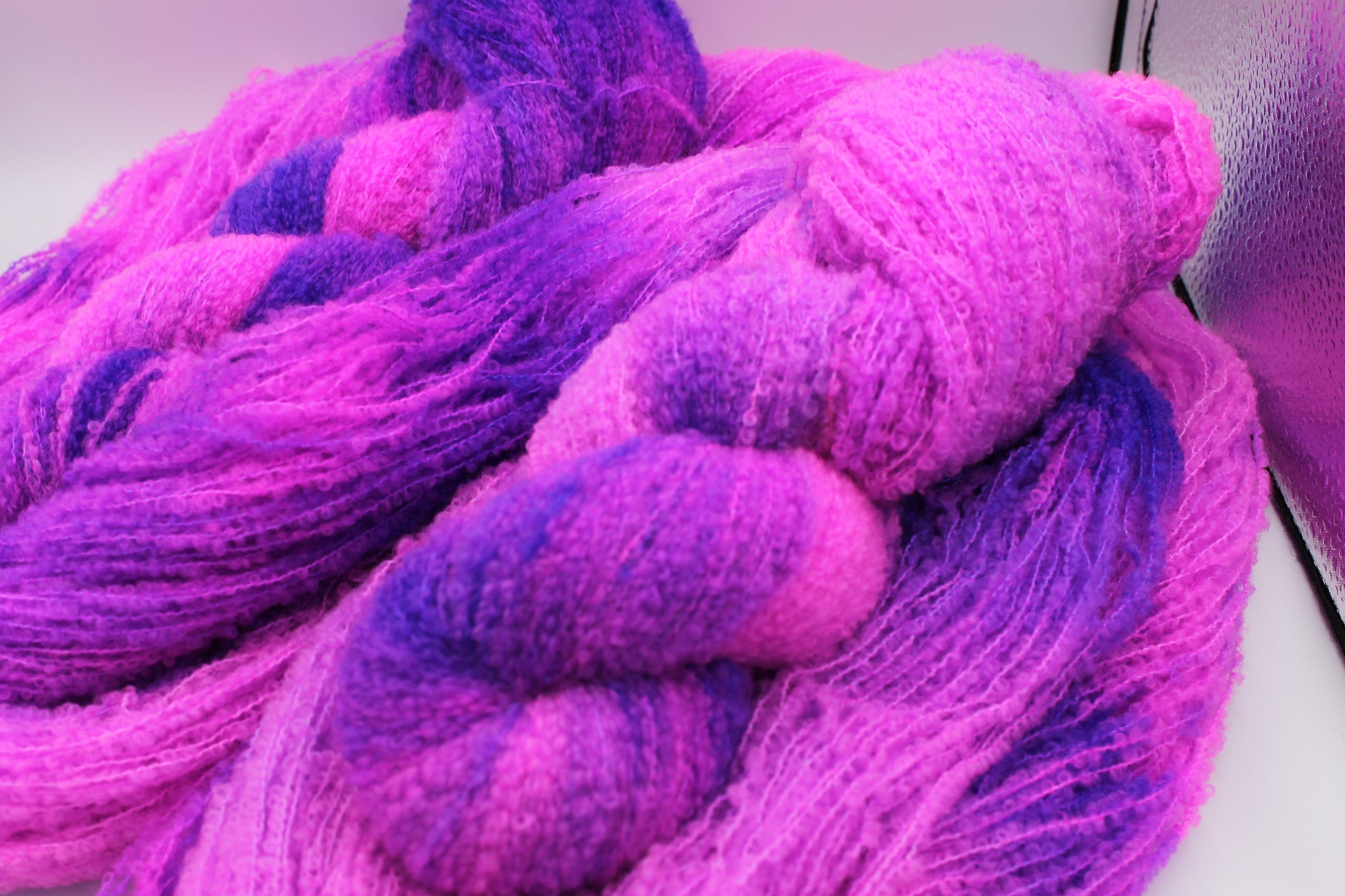 Pixie Plum 80% Superfine Merino 20% Nylon. Lace weight Boucle 1 x 100g Skein. Each skein sports a range of complimentary colours swirled throughout the yarn. Approximately 600m per 100g skein. Each skein is hand-dyed using professional acid dyes. Although each skein is dyed in a batch, unique they will remain and no other skein will ever be quite like it. Every effort has been made to wash any excess dye from the yarn, but some may remain; especially with heavy colours. It is recommended to hand wash separately. Shape the products made from this yarn whilst damp and dry flat. Colour represented on a screen can vary from the colour of the yarn supplied although we have made effort to ensure accuracy. Shipping information please read: Standard shipping is second class and does not include tracking or insurance. We use waterproof biodegradable packaging. If you have any questions please feel free to email me.