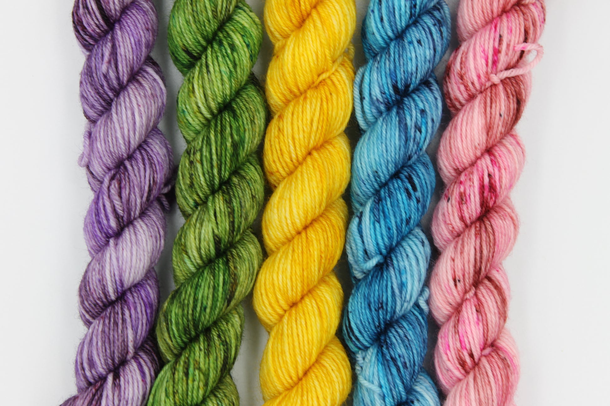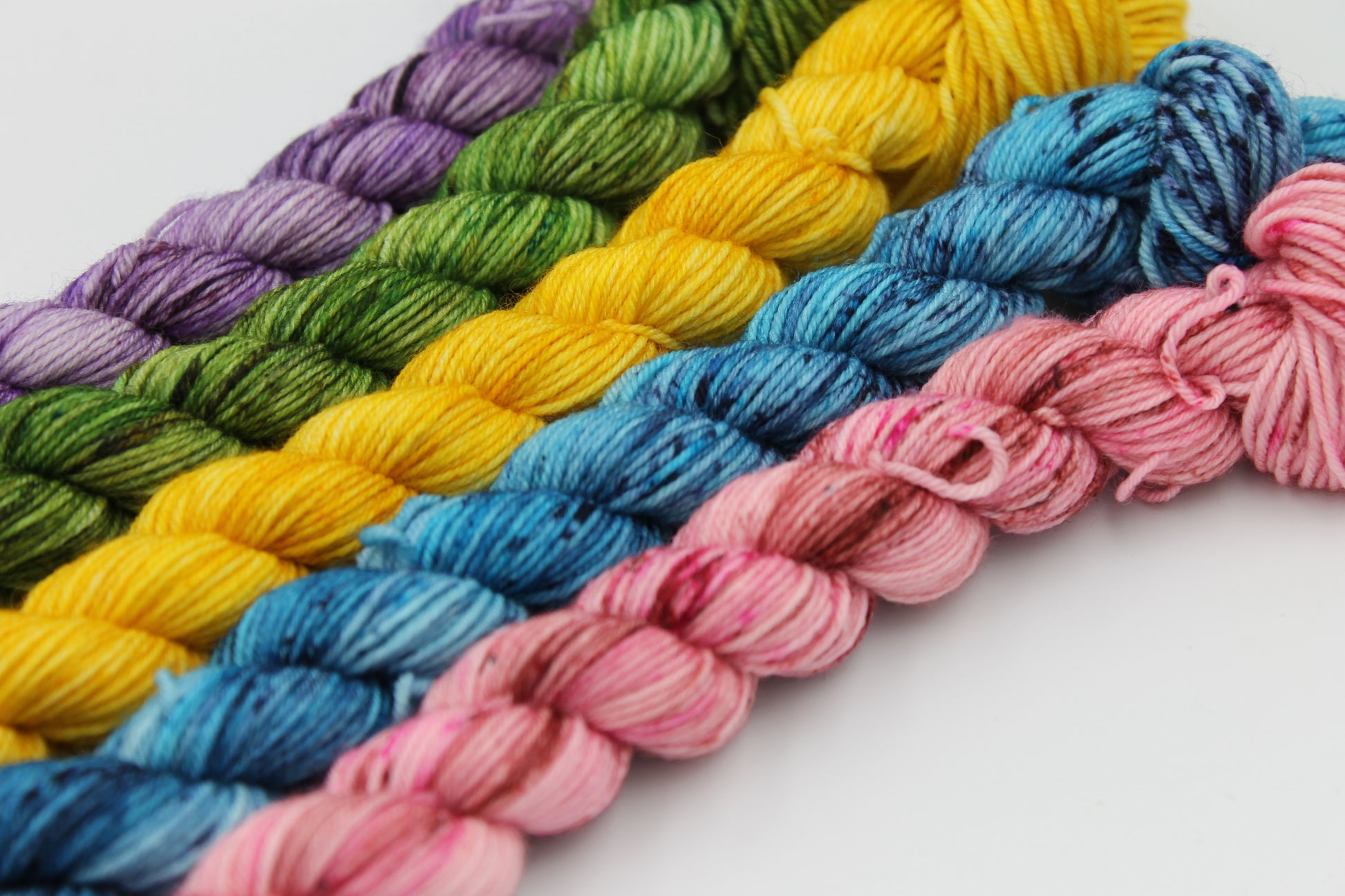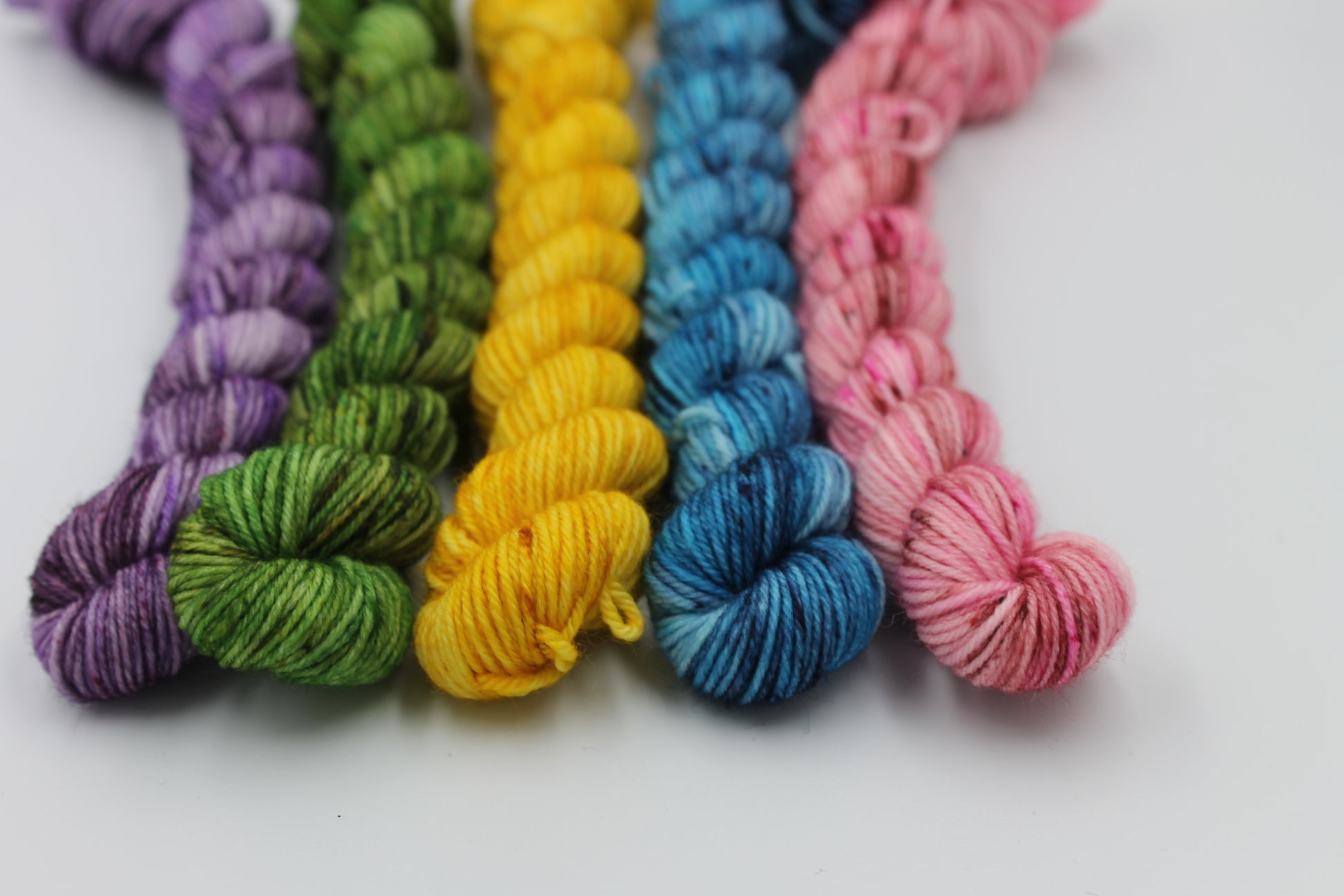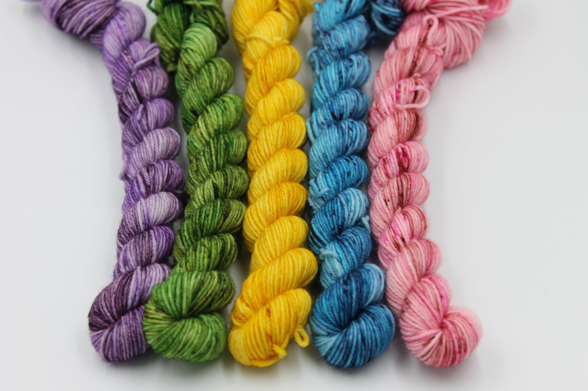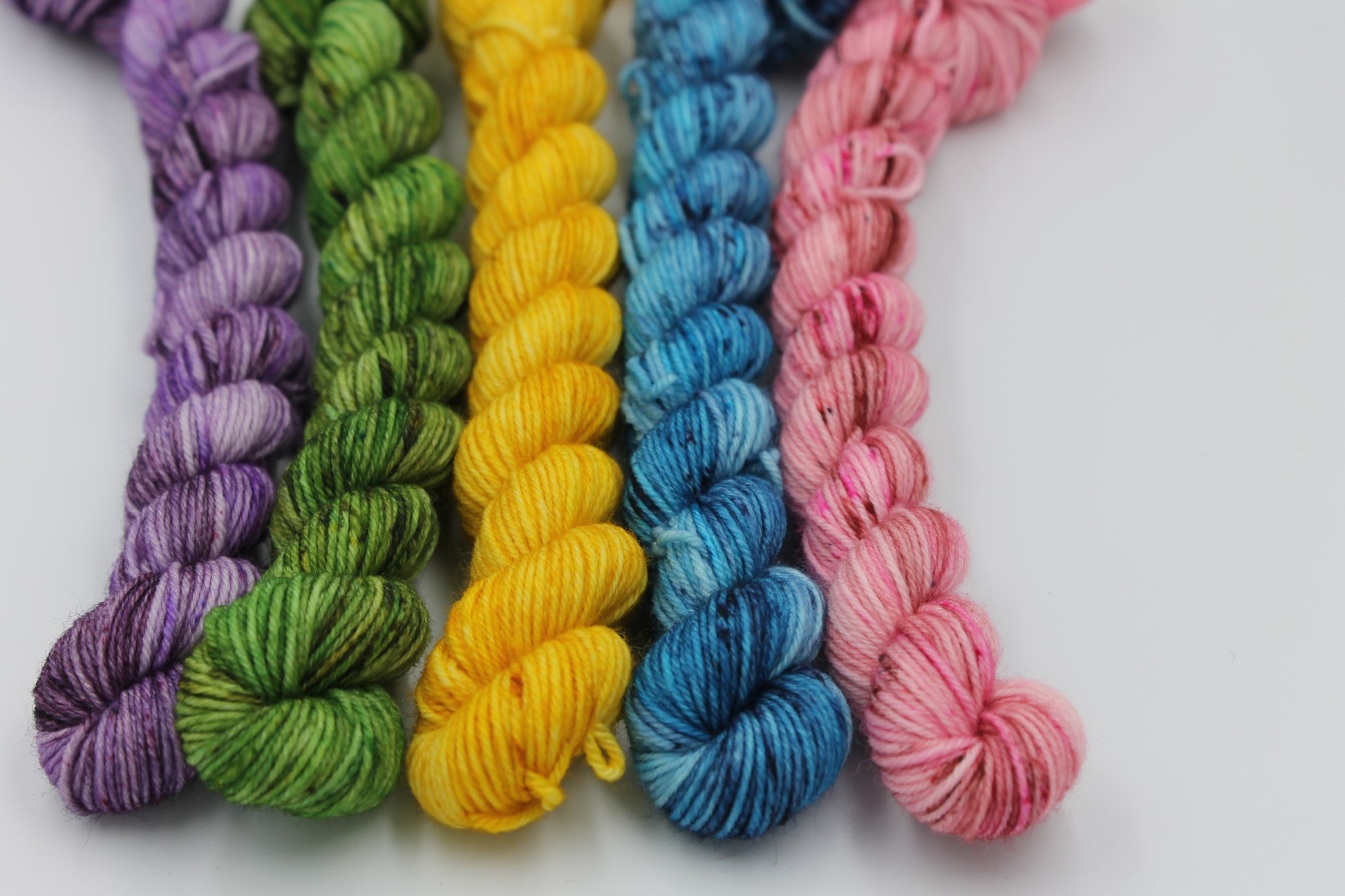 Spotty Dotty Sock SuperWash Merino 75% and Nylon 25%. 5 of 20g Mini Skeins Each mini skein sports a different base colour and a range of complementary colours swirled throughout the yarn. Hand dyed sock yarn Approximately 85m per 20g mini skein totalling approximately 425m. 75% super-wash Merino 25% Nylon Each skein is hand-dyed using professional acid dyes. Although each skein is dyed in a batch, unique they will remain and no other skein will ever be quite like it. Every effort has been made to wash any excess dye from the yarn, but some may remain; especially with heavy colours. It is recommended to hand wash separately. Shape the products made from this yarn whilst damp and dry flat. Colour represented on a screen can vary from the colour of the yarn supplied although we have made effort to ensure accuracy. Shipping information please read: Standard shipping is second class and does not include tracking or insurance. We use waterproof biodegradable packaging. If you have any questions please feel free to email me.